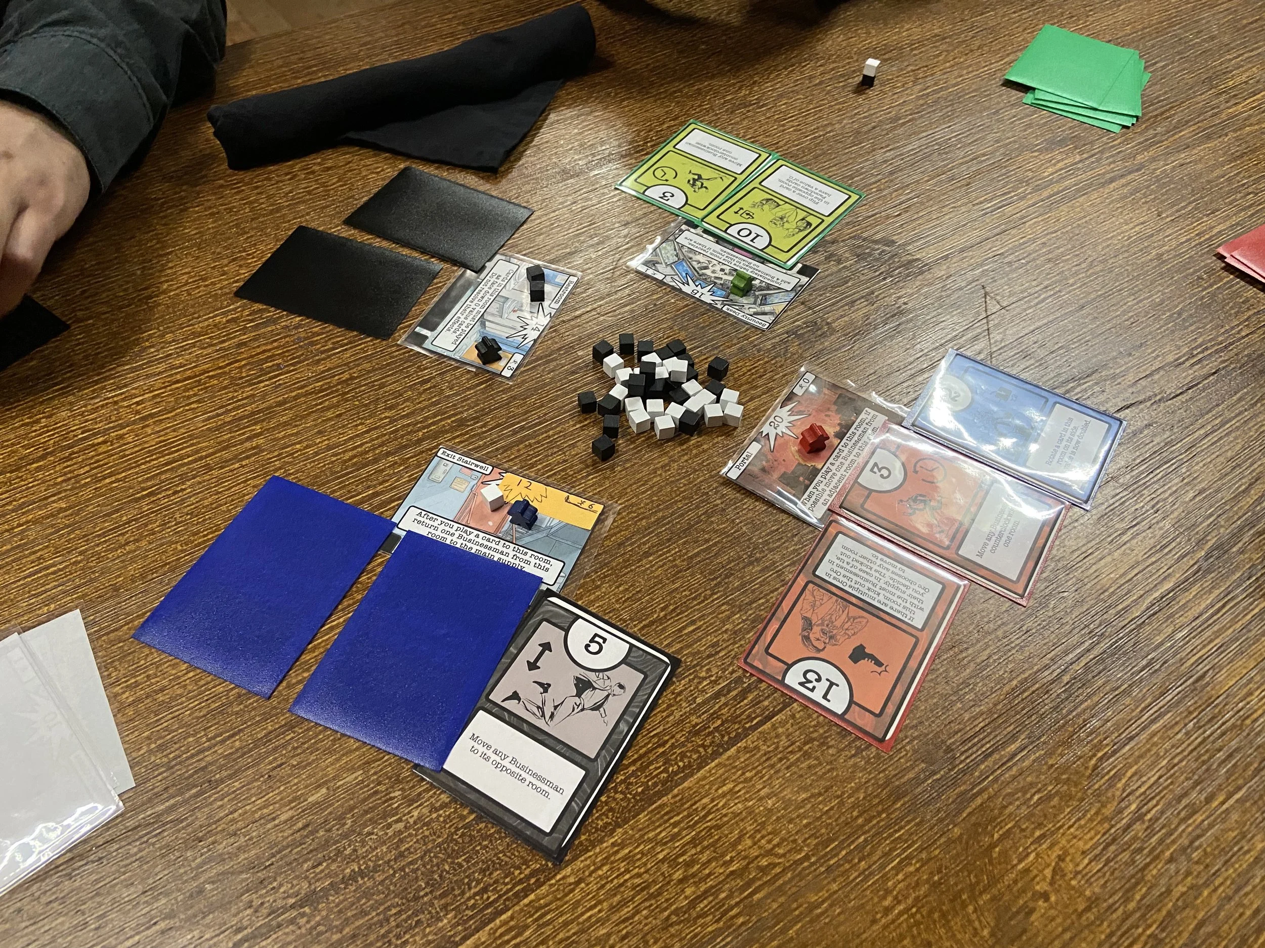 So what’s next? In its current state I consider the game to be close to done (at least gameplay wise), however there are still some tweaks I need to do to make the end game more interesting and less deterministic. Currently in the final round of the game, if a player is too far behind in points, they may have no way to catch up to first place rendering their final plays pointless other than to spoil other players. I recently added a “slow down mechanic” card that solely impacts the first place player to prevent them from totally running away with the game, but there is still room for improvement here. This last weekend a playtester proposed the idea of swapping the current point cubes with two sided point tokens. Each token would have a secret number value (from 1 to 2 or 3) on one side that is hidden to all players until the end of the game keeping player’s true scores unknown until the final reveal. I think this is an elegant way to add some end game ambiguity without adding any complexity. However I will need to do a good bit of playtesting to make sure this doesn’t feel too unfair for the first place player. Alternatively, I could have my new “slow down” card make the first place player give a point to the last place player. Another playtester proposed hidden objective cards. Regardless, more design work needs to be done here.