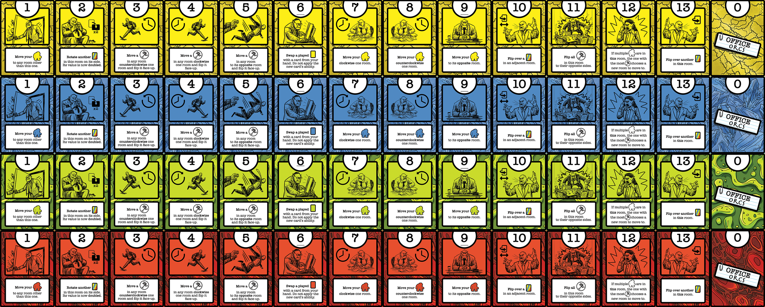 Balancing, balancing, balancing. I think I’m at the point where I don’t want to add anything else to the game. Office Orcs is a small box card game, and introducing any more complexity would clash with the expectations the game gives off visually and in it’s theme. Now it is time to test and keep testing. There is a lot of math to balance here. Getting the point values correct on the End of Round objectives has been difficult. The easy objectives should have less points than the hard objectives, but sometimes easy/hard is subjective depending on who is playing. When I’m not testing with real people I’m testing it on my screentop prototype and keeping track of wins, losses, points, objectives… it’s a lot. I’ll get there.